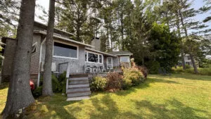 FIRST FLOOR: Open floor plan with views of the ocean from nearly every window. A well-stocked Kitchen offers incredible views, and its dining counter offers the perfect spot for that morning cup of coffee and blueberry muffin. Expansive Living/Dining Area with showcase granite fireplace, Roku (internet) television, dining table that seats 6-8 easily, skylight and cathedral ceilings. Door to the back deck. Primary Bedroom suite with King bed, door to deck, and a Full Bath with combined tub and shower, which can be en suite with the Primary Bedroom or shared with the adjacent Bedroom with Double bed. On the opposite side of the Living room, a third Bedroom features a Queen bed and water views. A Full Bath with separate shower room is shared with the second floor bedroom.
