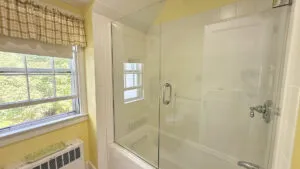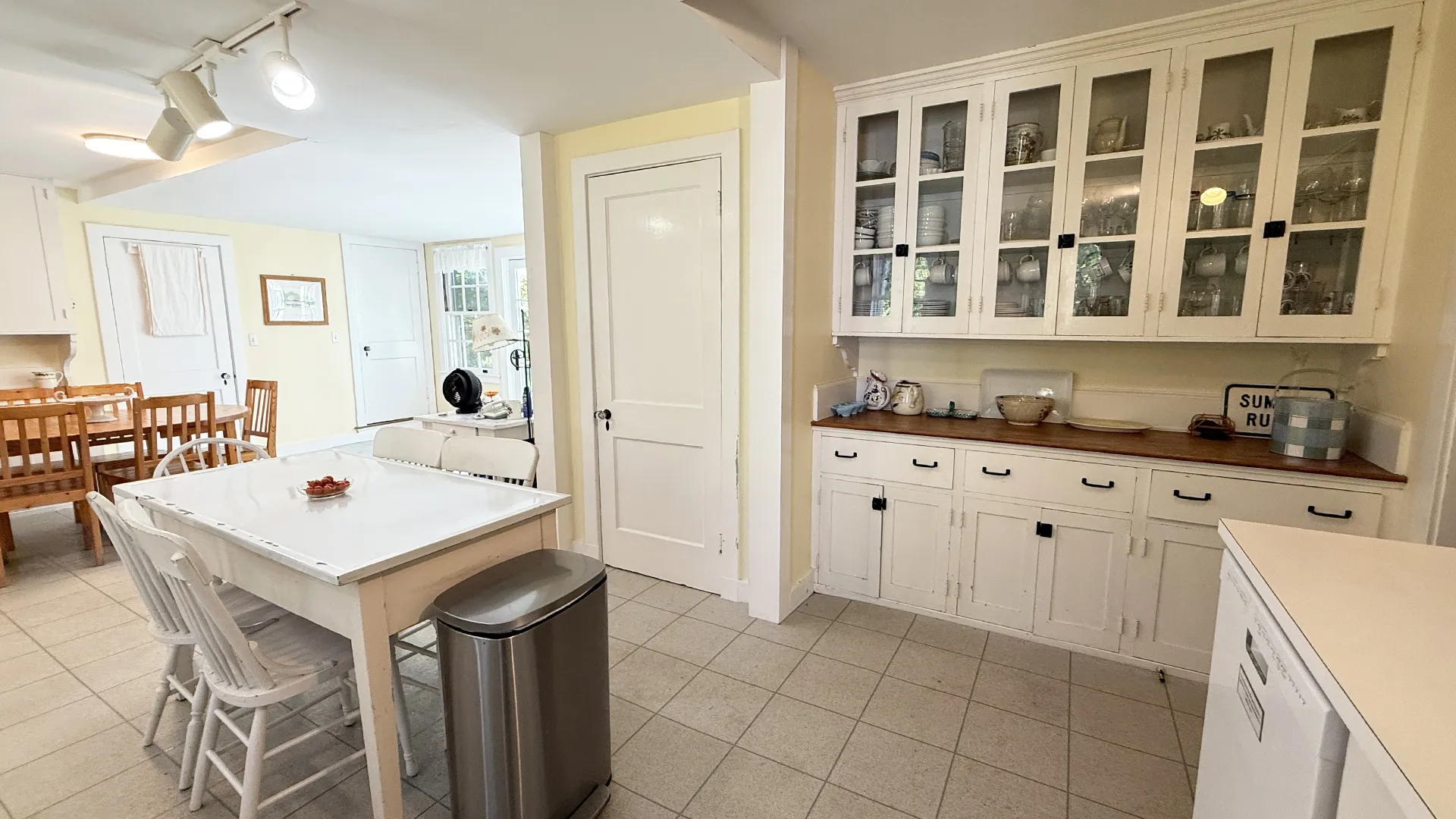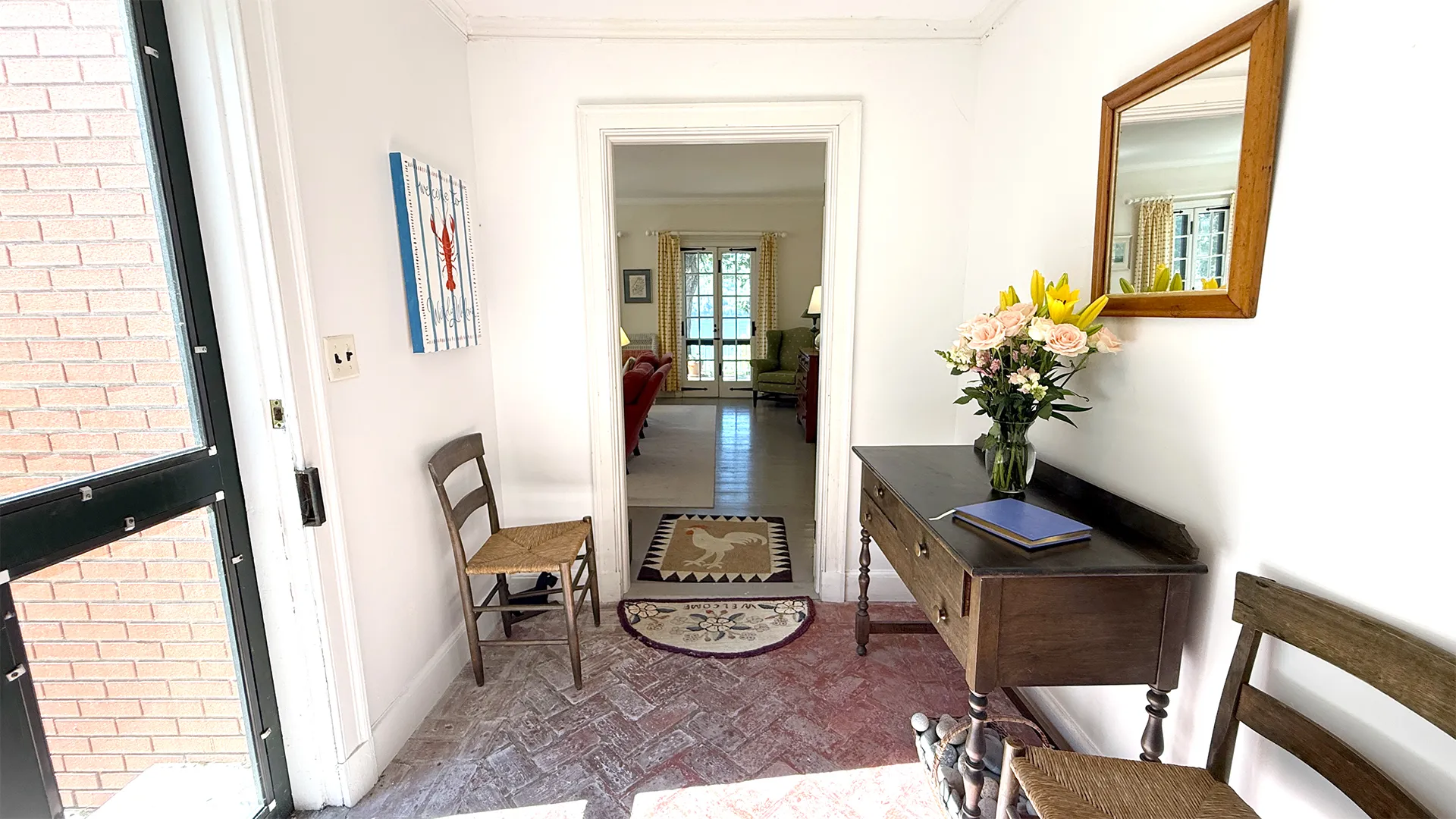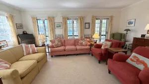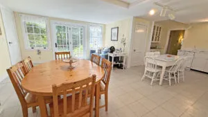 et.FIRST FLOOR: Brick entry with adjacent small powder room leads to Living Room with fireplace and TV. Spacious formal Dining Room seats ten to twelve comfortably. Living Room and Dining Room both have French doors that open to furnished terrace overlooking water. Large eat-in Kitchen. Small den with desk. Bedroom with Twin beds with Private Full Bath with large walk-in shower. Laundry located in garage.