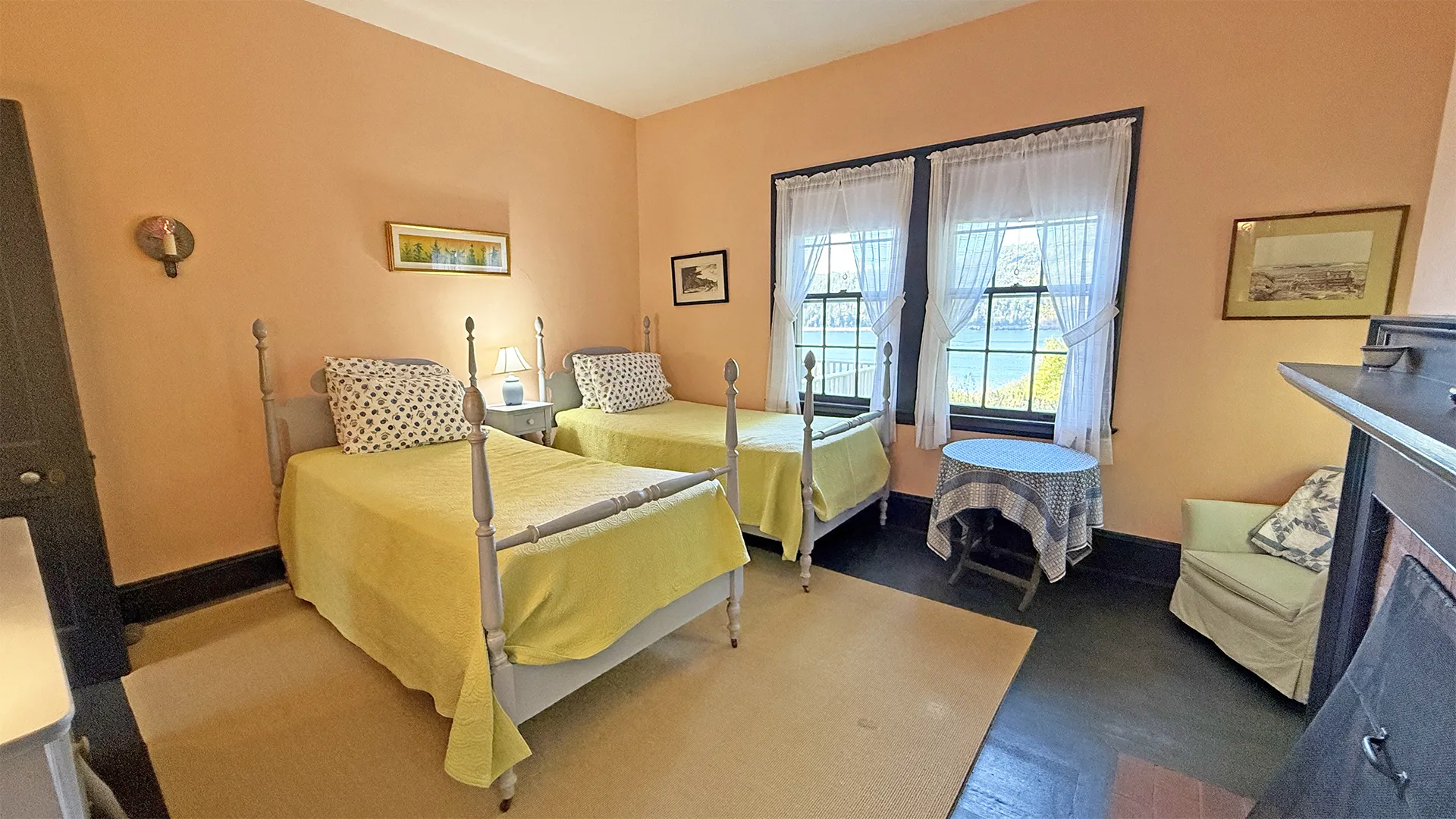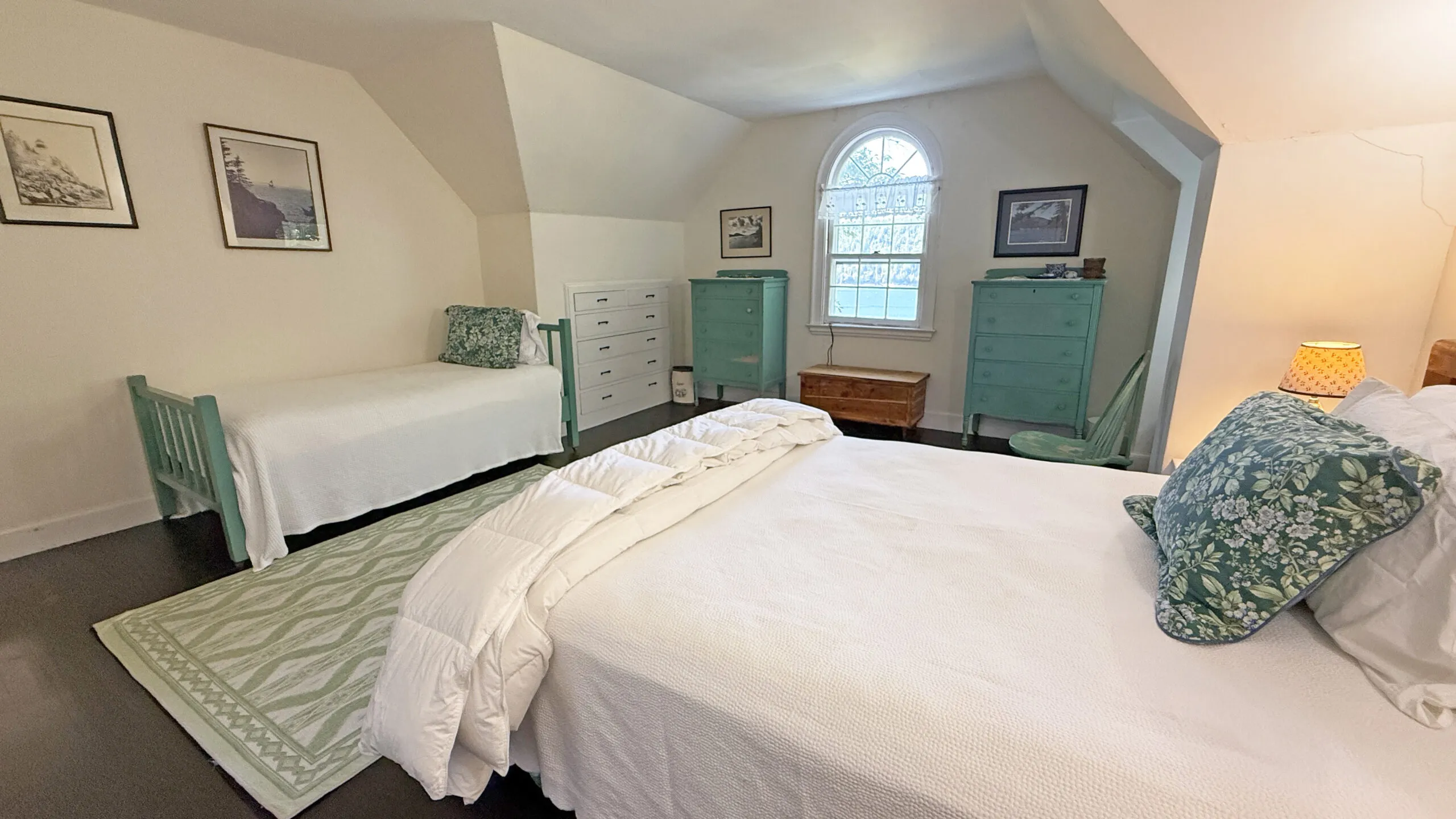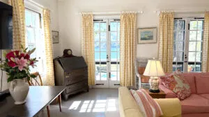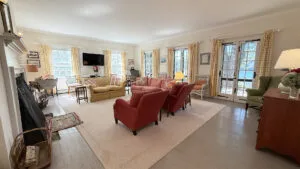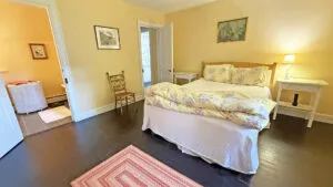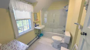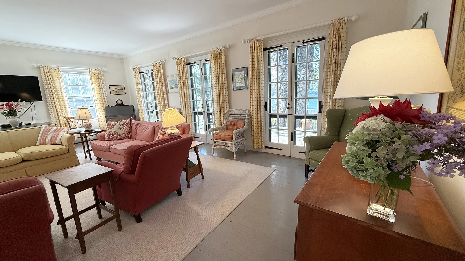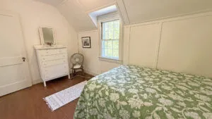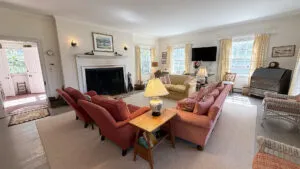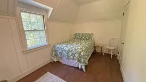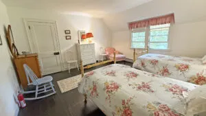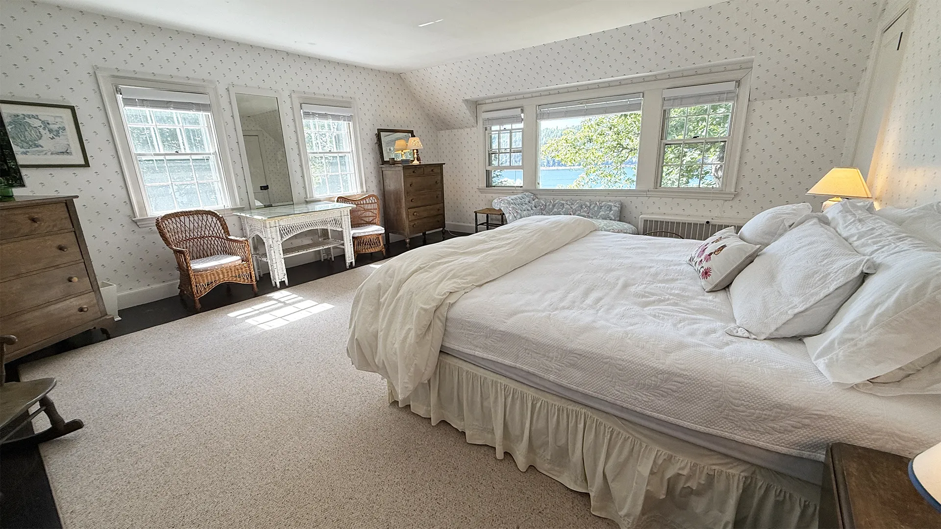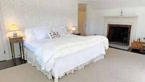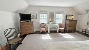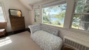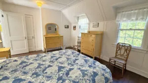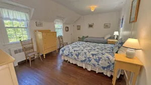 SECOND FLOOR: Primary Bedroom with King bed, TV, water views and private Full Bath with separate tub and large walk-in shower. Facing the water are two additional Bedrooms: one with Twin beds, one with a Queen bed and a Single bed. These share a Full Bath with tub and shower in the hall. The fourth water-facing room has a Queen bed and a private Full Bath with tub. The East Wing boasts a sitting area in the main hall and three additional Bedrooms and one full Bath with tub and shower. The first bedroom has both a Queen and Single bed, the second a Single bed, and the third has a Double bed.