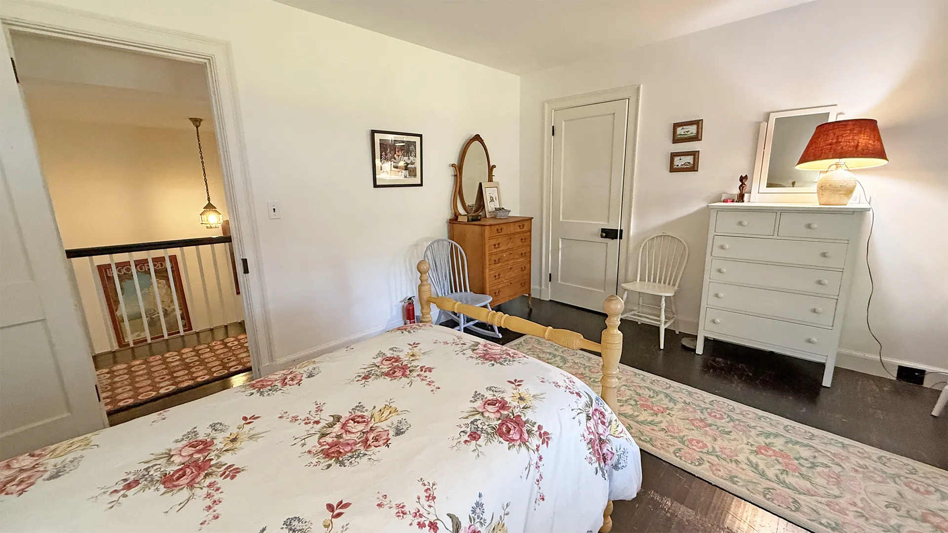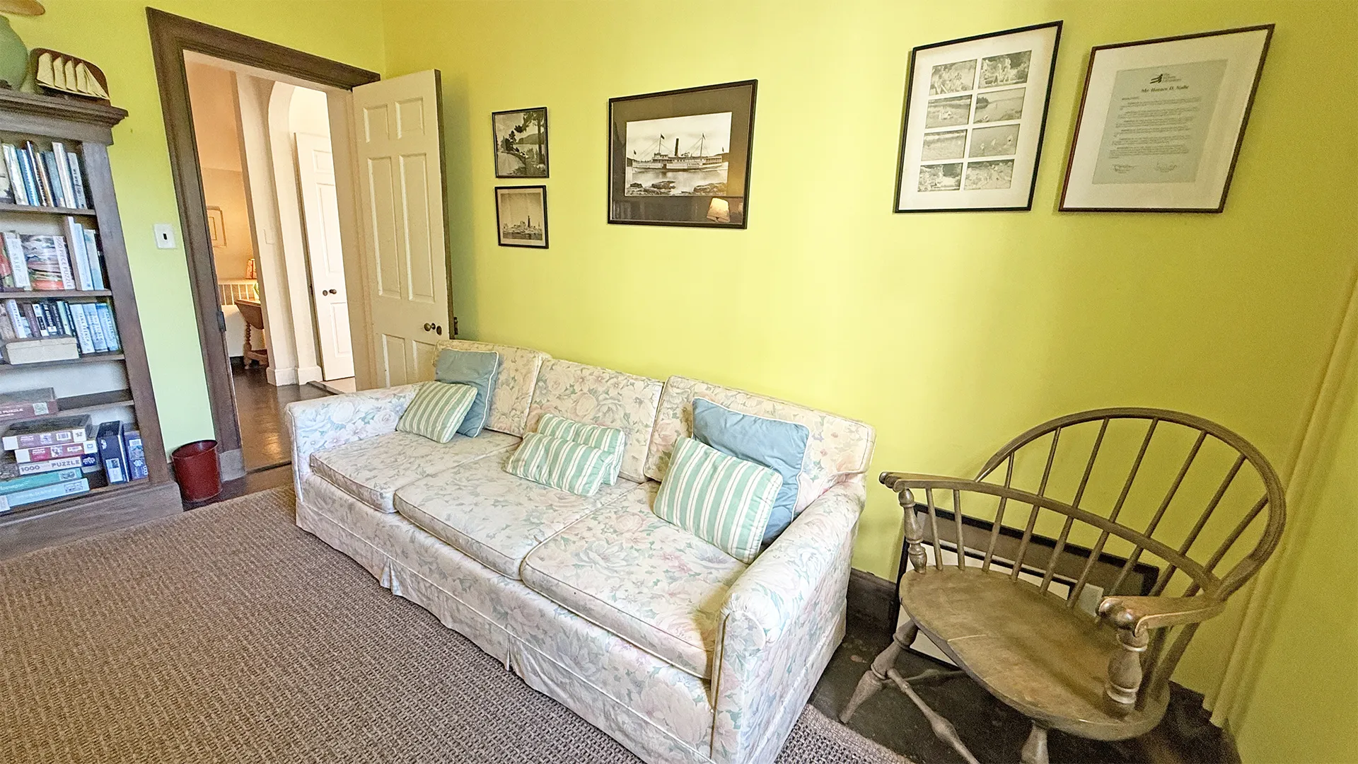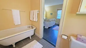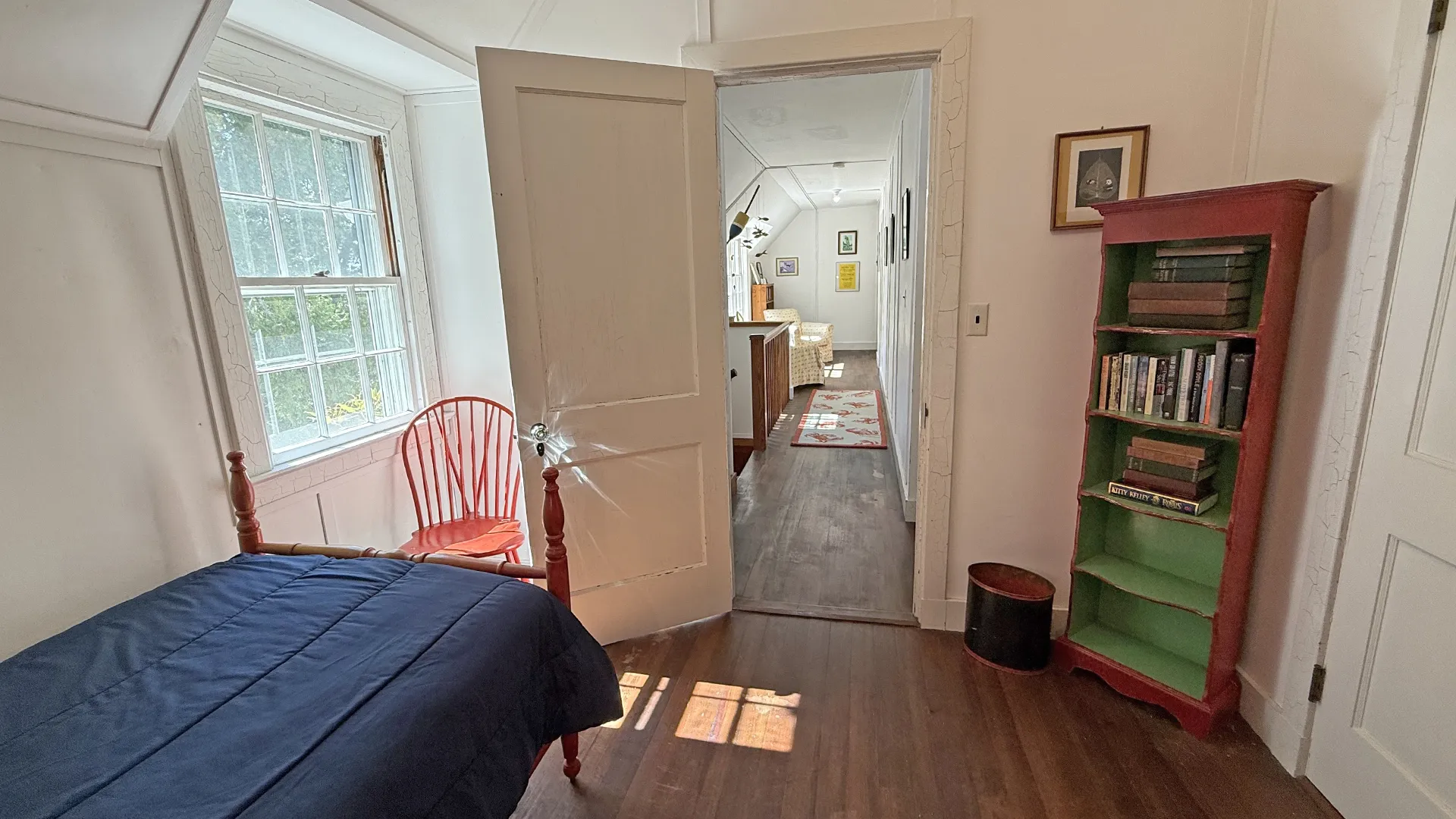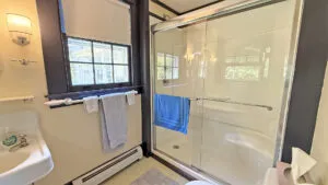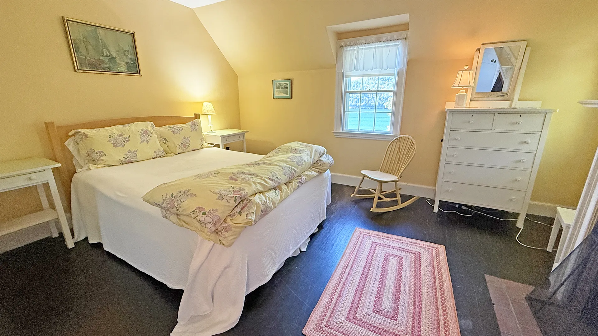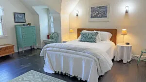 SECOND FLOOR: Primary Bedroom with King bed, TV, water views and private Full Bath with separate tub and large walk-in shower. Facing the water are two additional Bedrooms: one with Twin beds, one with a Queen bed and a Single bed. These share a Full Bath with tub and shower in the hall. The fourth water-facing room has a Queen bed and a private Full Bath with tub. The East Wing boasts a sitting area in the main hall and three additional Bedrooms and one full Bath with tub and shower. The first bedroom has both a Queen and Single bed, the second a Single bed, and the third has a Double bed.