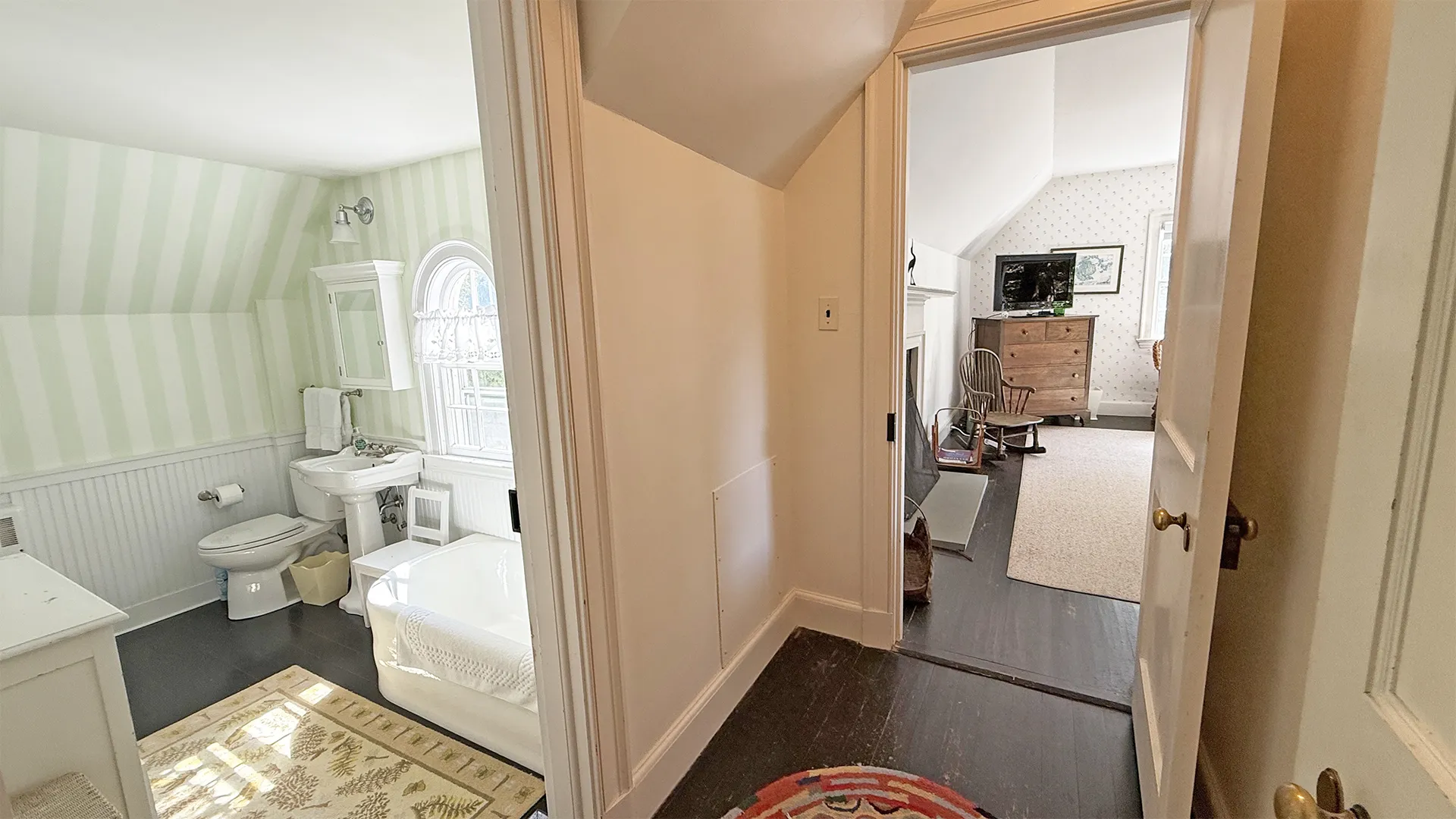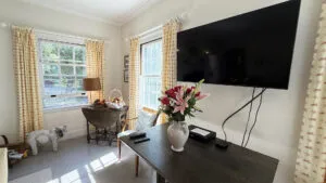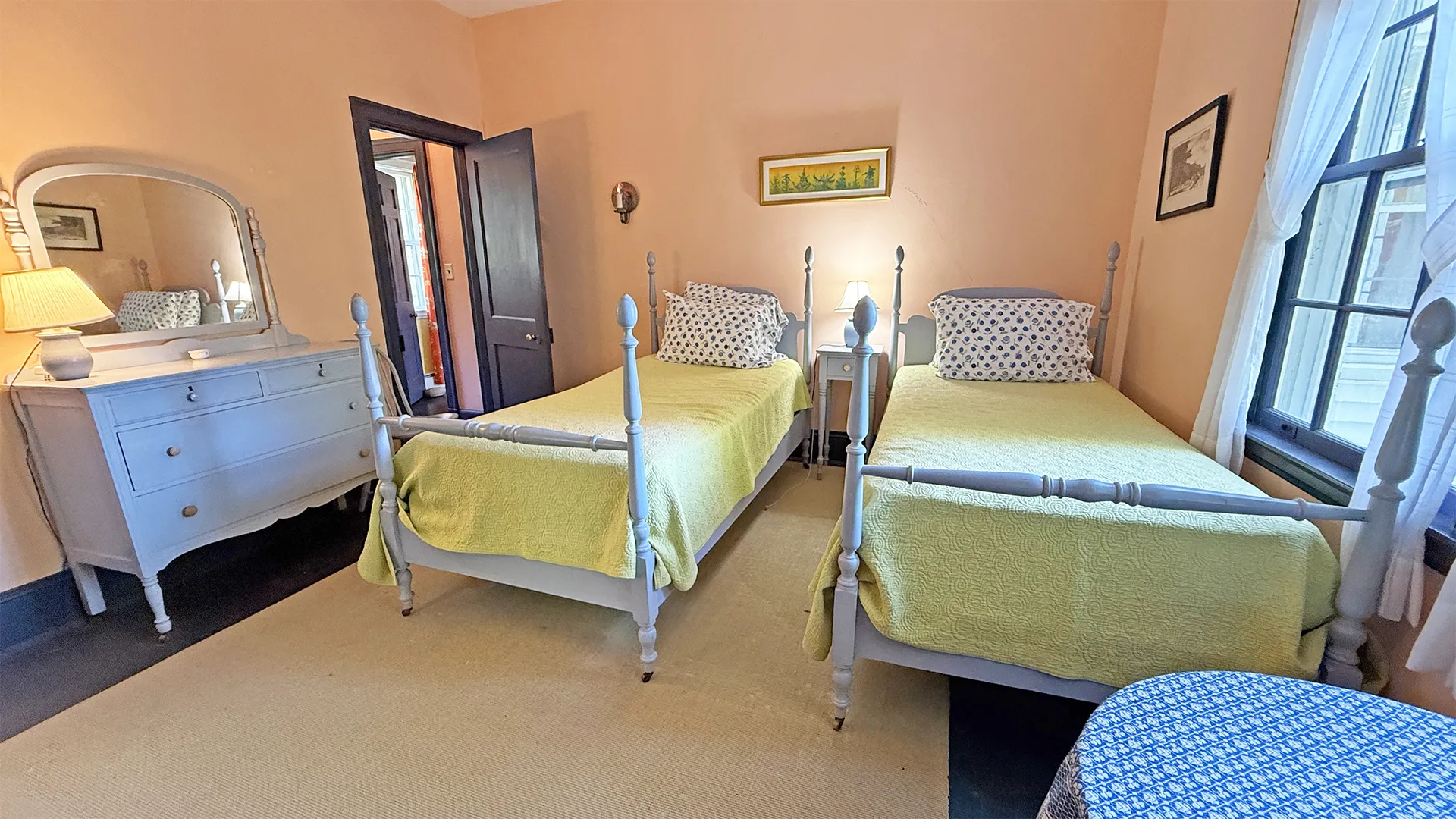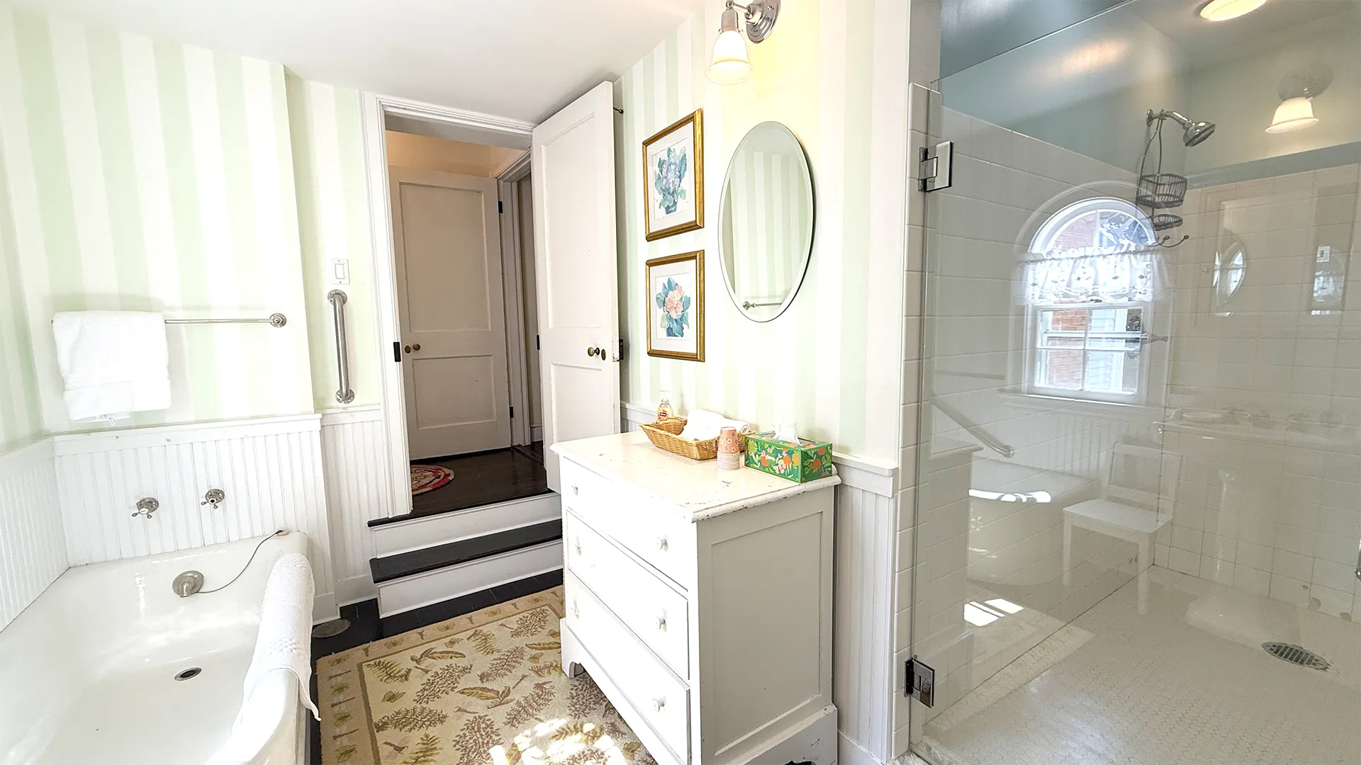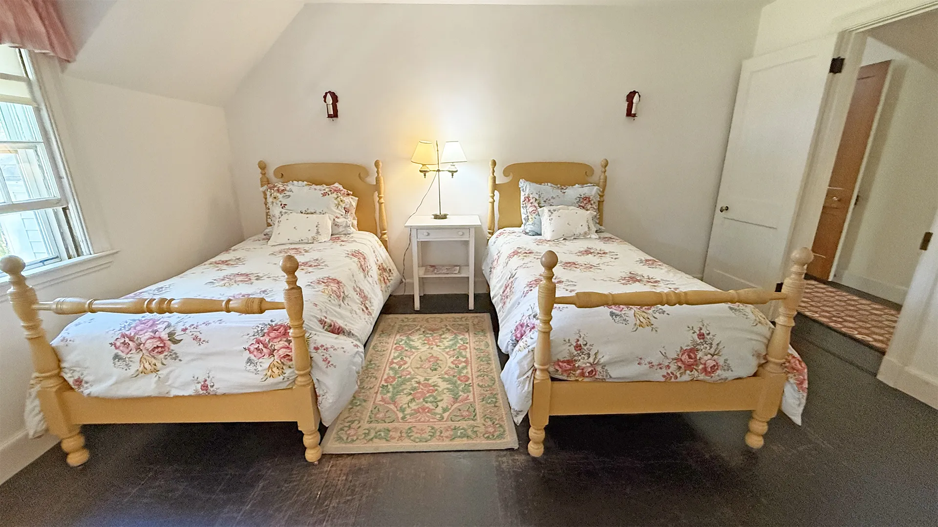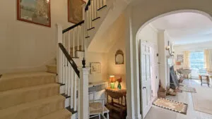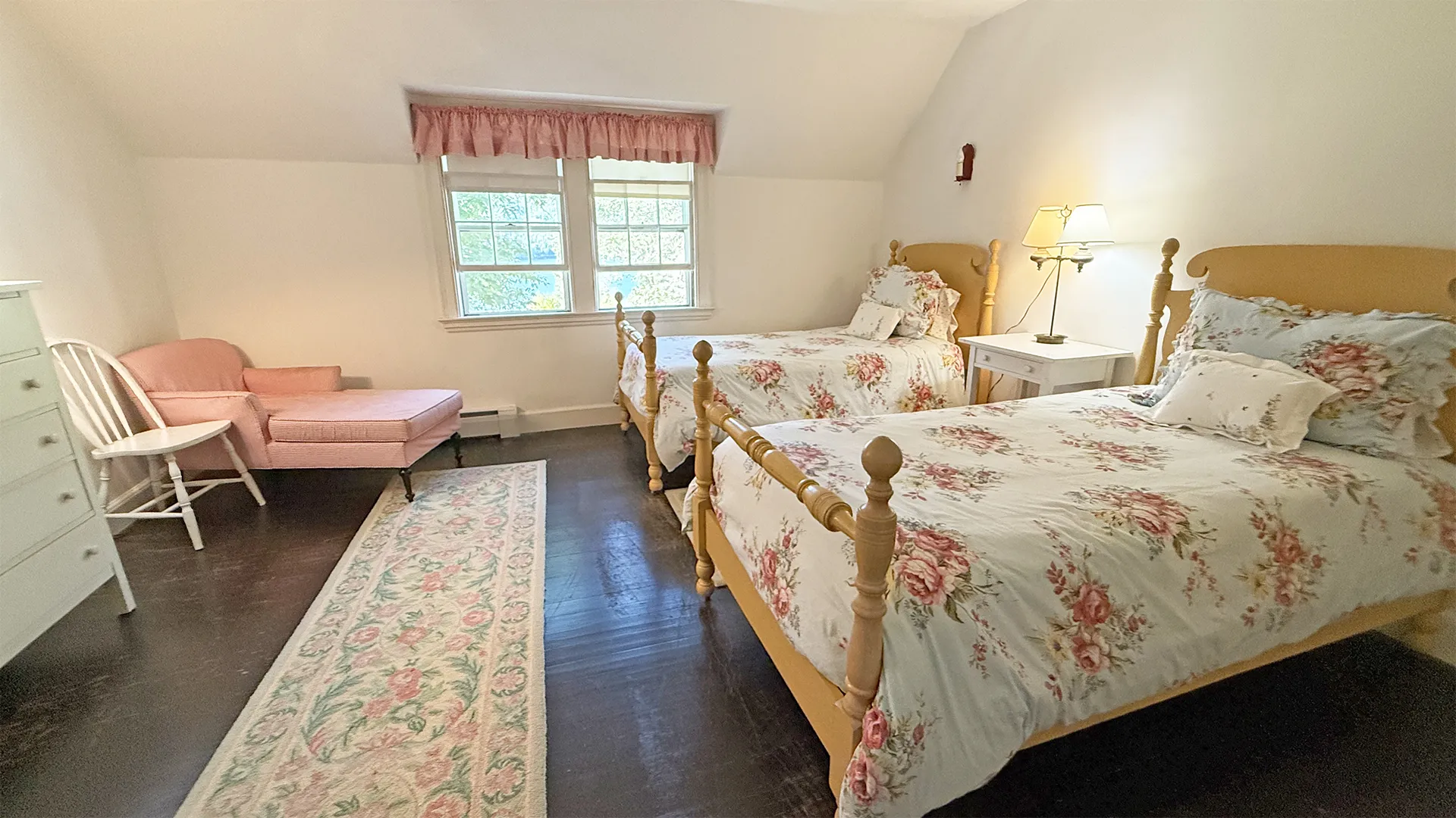 SECOND FLOOR: Primary Bedroom with King bed, TV, water views and private Full Bath with separate tub and large walk-in shower. Facing the water are two additional Bedrooms: one with Twin beds, one with a Queen bed and a Single bed. These share a Full Bath with tub and shower in the hall. The fourth water-facing room has a Queen bed and a private Full Bath with tub. The East Wing boasts a sitting area in the main hall and three additional Bedrooms and one full Bath with tub and shower. The first bedroom has both a Queen and Single bed, the second a Single bed, and the third has a Double bed.