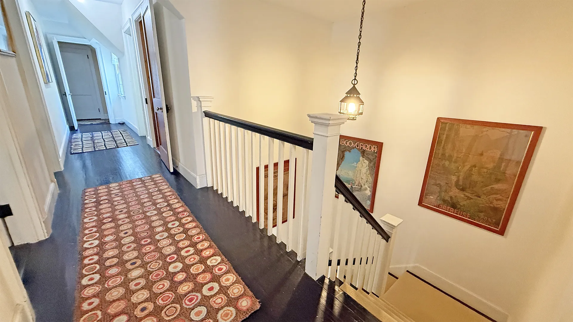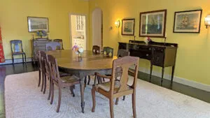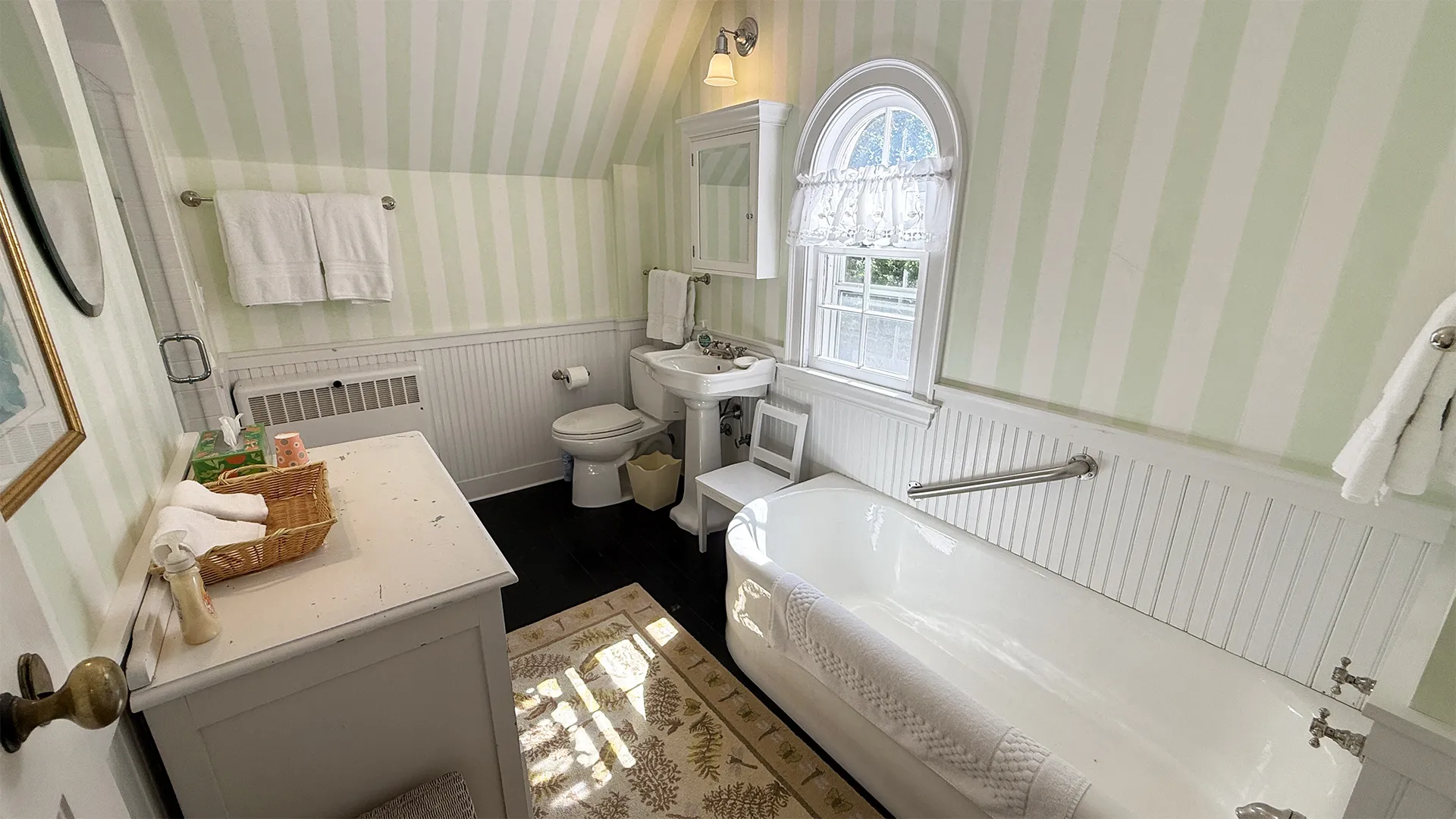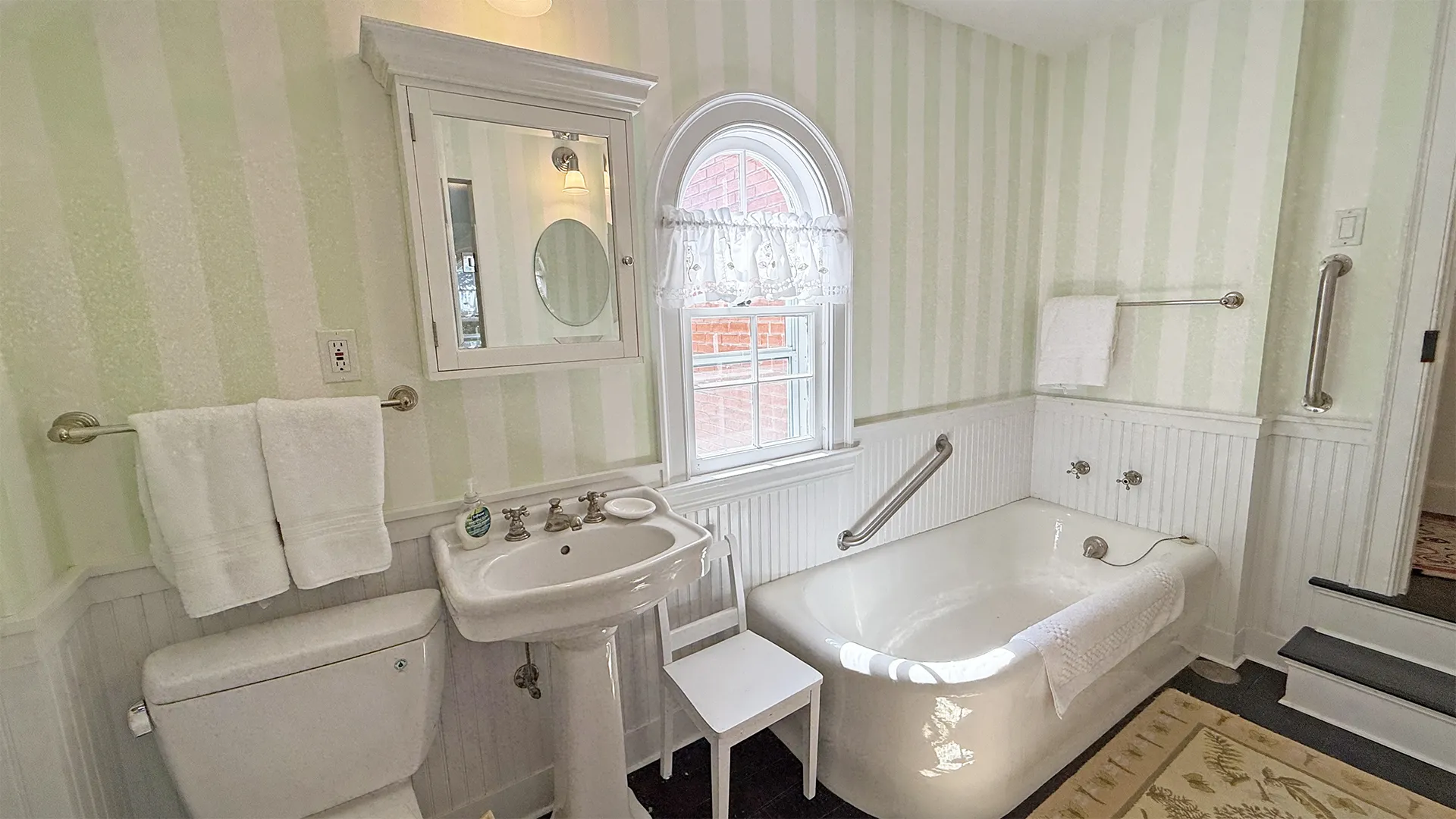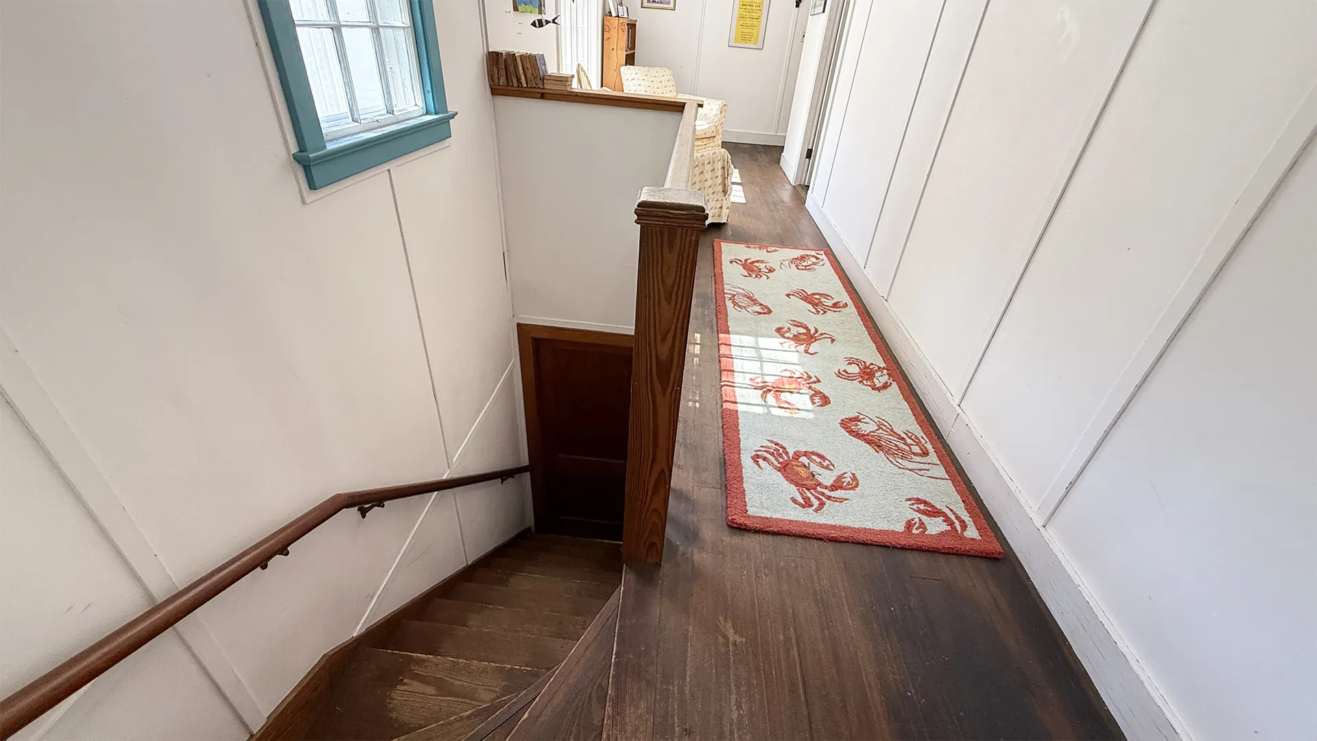 SECOND FLOOR: Primary Bedroom with King bed, TV, water views and private Full Bath with separate tub and large walk-in shower. Facing the water are two additional Bedrooms: one with Twin beds, one with a Queen bed and a Single bed. These share a Full Bath with tub and shower in the hall. The fourth water-facing room has a Queen bed and a private Full Bath with tub. The East Wing boasts a sitting area in the main hall and three additional Bedrooms and one full Bath with tub and shower. The first bedroom has both a Queen and Single bed, the second a Single bed, and the third has a Double bed.