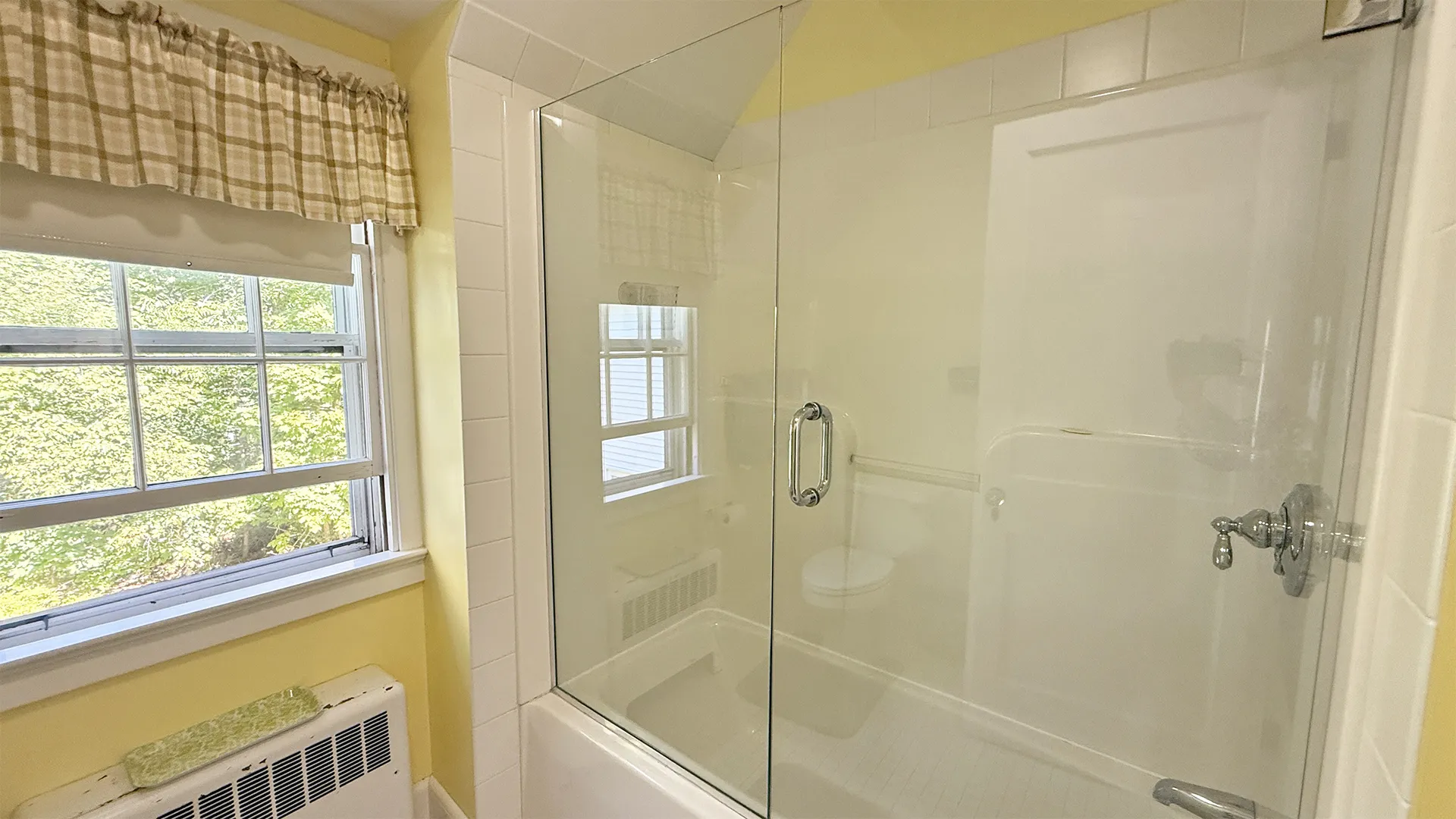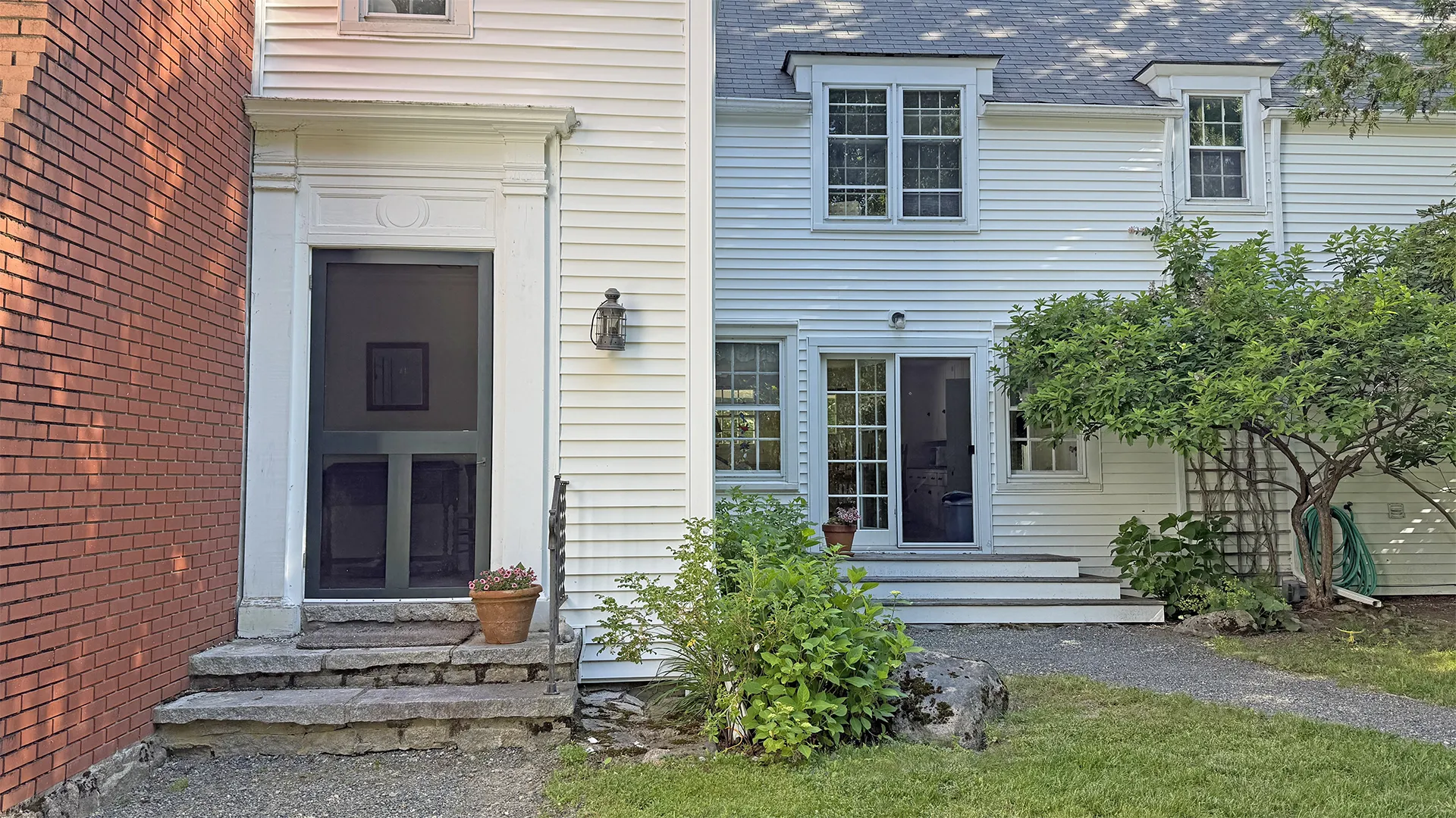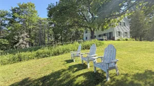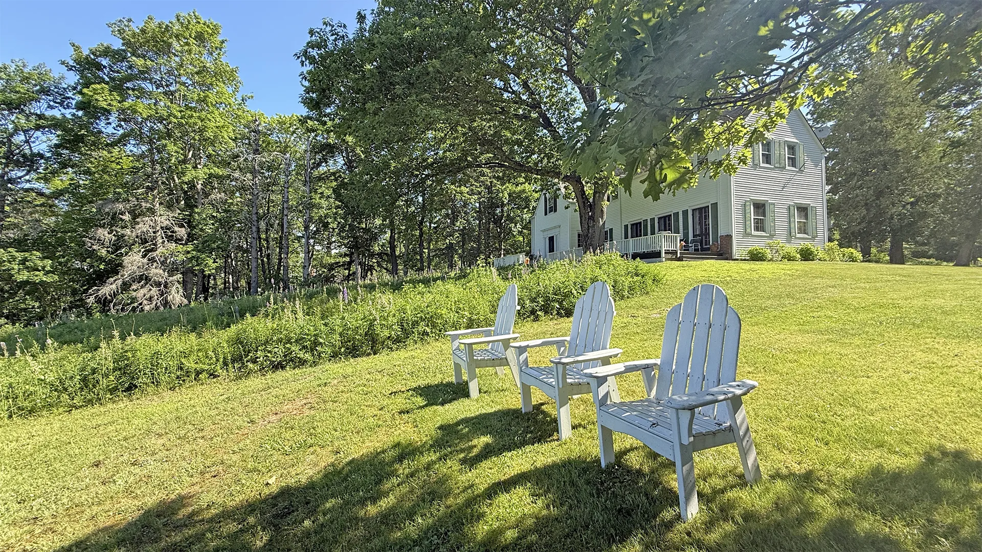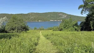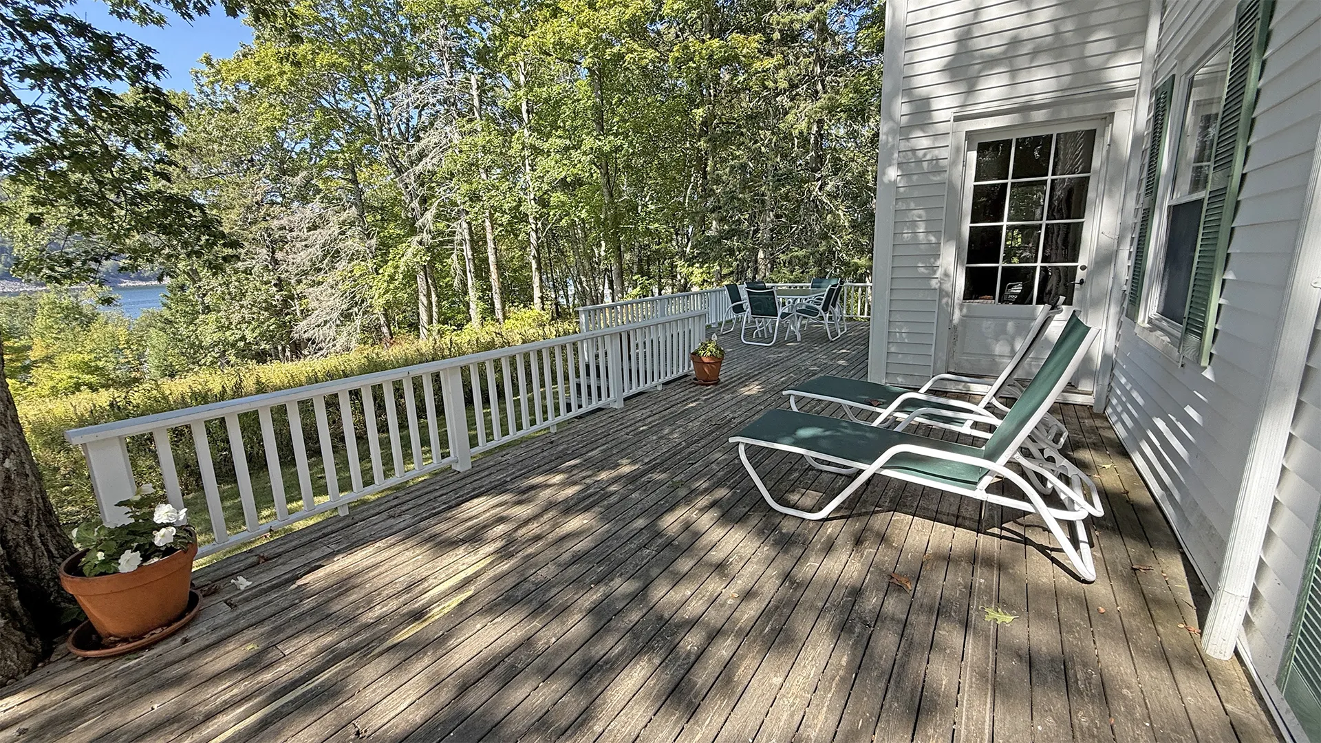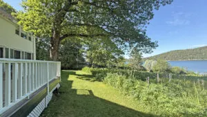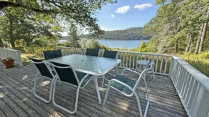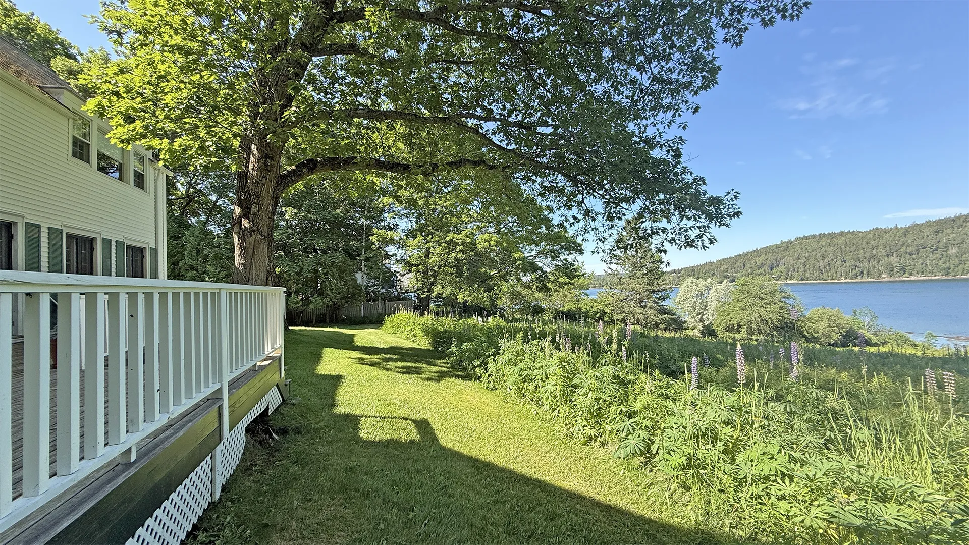OUTDOOR SPACES: Furnished terrace with water and meadow views, with a mowed path to the water.